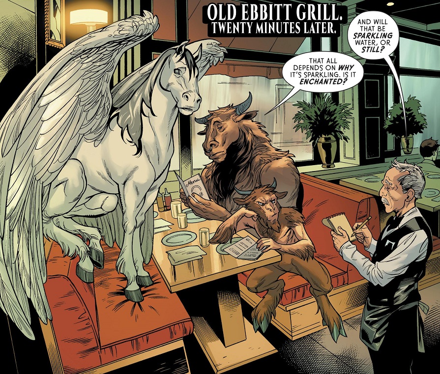 The three magical creatures from the first half of the previous storyline have immigrated to America, but they’re having a hard time fitting in. There’s a minotaur, a pegasus and a satyr. They bicker, they banter, they crack wise and they struggle to fit into basic human society, which is pretty reasonable. I don’t see what would be gained by having them sit down with an actual immigration official, or go to a human restaurant. Though they do pick up a waitress along the way, who seems to fangirl over the possibility of going on a magical quest with a bunch of mythical creatures — even though she can’t see that this trio is pretty much as normal as any other person. They’re more like bums than they are grand mythological beings.