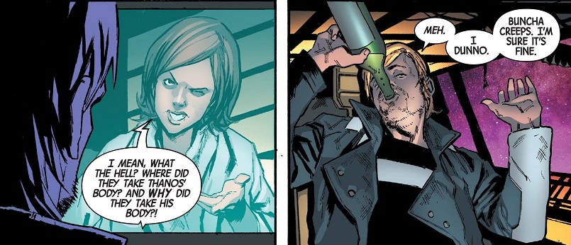 For that matter, I wish Cates would actually use Gamora in this comic instead of just having everybody talk about her and past events. She’s clearly important to the story and to everyone’s motivations, and I don’t understand why she’s not being used. I didn’t read Infinity Wars or Infinity Warps or whatever garbage Big Event proceeded this. From everything I’ve gleaned online, nobody liked it and it was terrible. So I have no clue what great events have transpired around Gamora, even though those great events are heavily influencing every single character in this comic and their actions.