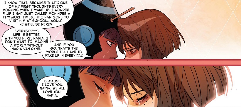 She finds her friend in the midst of a depressive episode, ready to end her life because she’s now realized what she did to everyone, and she’s convinced they will all be better off if they’d never even heard of Nadia Pym. But Priya stops her and tells Nadia the story of how she lost her brother to depression and suicide, and how she lives every day wondering if there was something she could have done differently to save him. She tells Nadia that everyone will feel the exact same way if Nadia kills herself, because they all love Nadia.