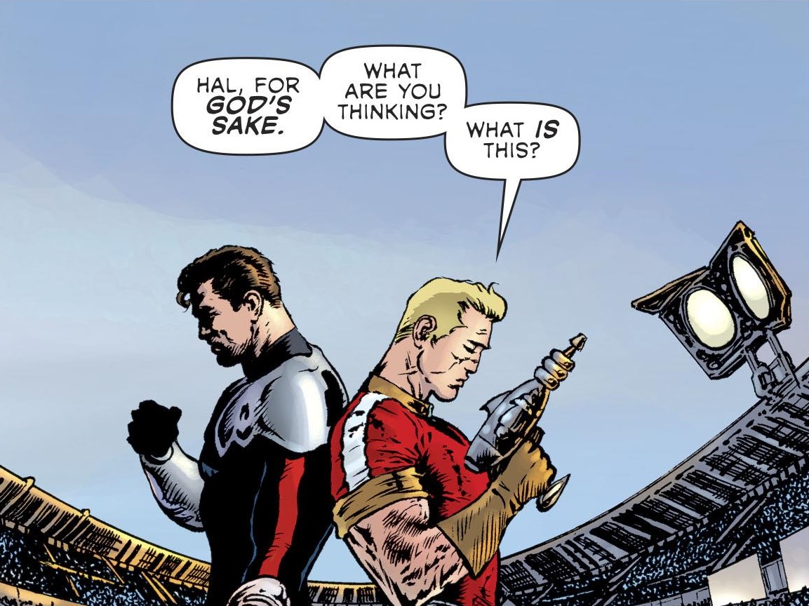 Hal Jordan seemingly kills Adam Strange in an old-fashioned duel, which earns Hal a meeting with Controller Mu. Along with keeping Strange’s daughter captive, Mu is also having trouble breaking into Hal’s GL ring. Mu reveals to Hal that not only does he know Hal is a spy, but Mu also lays out his whole plan: to control a peaceful and loving universe, or for there to be no universe at all. To that end, Mu reveals a U-Bomb ready to wipe out all of existence. Mu offers for Hal to kill him, thereby fulfilling Hal’s mission, but doing so will set off the U-Bomb, thereby fulfilling one of Mu’s plans.