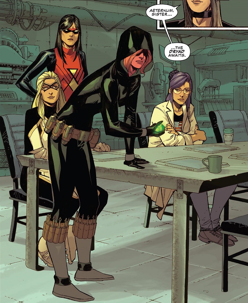 The Daughters of Liberty side of things is less interesting. The group still doesn’t make much sense in the grand scheme of things. How long have they been a group using that name? Do they only use that name when they’re secretly assisting Captain America with something? Why couldn’t they all just get together on their own to help Steve? Why just women? Then there’s this new character, Dryad, who I didn’t realize was a new character until maybe halfway through the issue. She looks like Black Widow in a cloak and hood. And everybody kept referring to her in the third person as “the Dryad”, which made me think it was some sort of machine or equipment or something, not an entirely new super-person standing right there. But she gets a big action scene, and a lot of mystique thrown her way, all of it so-far unearned.