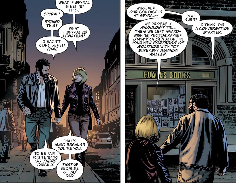 Meanwhile, Clark and Lois go in disguise to meet with their Spyral contact, Tiger (from the Grayson comic). It’s a tense standoff because Tiger doesn’t trust Chaz and his partner showing up out of the blue like this. Tiger also reveals that not only was Spyral created to spy on superheroes (which they already knew), but Leviathan was created by the same person to give Spyral something to do when they weren’t spying on superheroes. Did we know that already? I don’t remember all of my Spyral and Leviathan facts. Also, Kate Kane is apparently the director of Spyral? Did we know that?