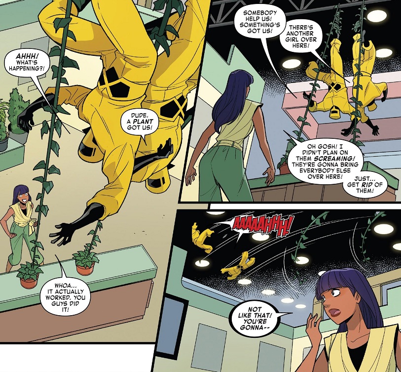 Everybody fights the bad guys, with a couple of fun character moments throughout. More specifically, the new villain is named Fantasma, and she can both hologram to look like anybody, and phase. She mocks Nadia for a bit, phasing through her attacks, but Nadia eventually short-circuits some of her gear. Fantasma escapes and runs into Janet and Taina, who have just taken down Whirlwind. Fantasma uses her holograms to get close and knock them both out. Meanwhile, Monica and her AIM goons are rounding up all the girl geniuses, including the rest of the cast — through Priya does get to briefly use her new plant powers to take out some bad guys.