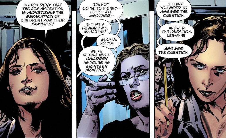 If I can nitpick a little bit, there are parts of the story that don’t fit together perfectly. The whole thing with the concentration camps/bribery comes out of nowhere. Lois is already sending Perry the story at the start of the comic, without revealing what the story is about, then we get a lot of stuff in the middle, only to return to the camps in the ending in the press briefing. It doesn’t really have anything to do with the rest of the story, other than being a pretty clear jab at the Trump Administration. I’m all for jabbing those monsters, but surely Rucka could have tied that bit better into the overall story. Likewise, Lois Lane doesn’t work for the Daily Planet at the moment and is instead off in Chicago writing a book. What’s she doing in Washington DC attending a White House press briefing?