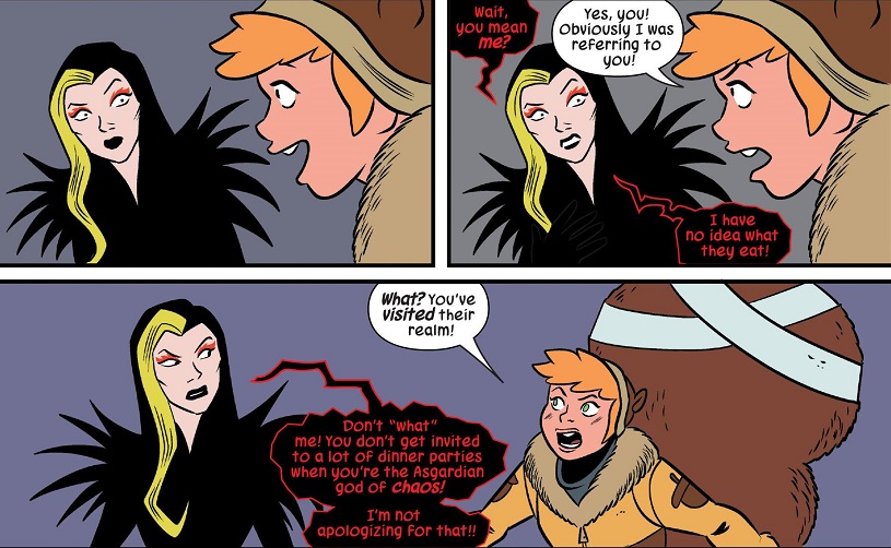 Ahem. So Squirrel Girl and Rachel’s big plan is to convince the frost giants to abandon their invasion because they can’t be expected to live in places like Florida. But the Giant-Man tie-in to War of the Realms specifically shows that the frost giants are based on Miami and are thriving! Boy, I really hope somebody got fired for that blunder.