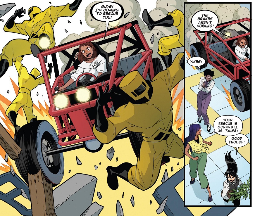 All of our heroes kick butt and save the day against the bad guys in really cool ways. Nadia beats up Fantasma, but the villain gets away. Taina drives a speed buggy to save everybody, and it turns into a mech suit for further ass-kicking. Monica, the lead villain, jumps through the portal to escape and blows it up from the other side, turning the New York portal into a vortex. Wasp goes big to save everybody, and Shay puts herself in harm’s way to shut down the portal. She’s in a coma afterwards. And Finesse, Brilliance and Amber get whomped and then join the good guys when they realize Monica abandoned them. Brilliance explains that they were convinced to join AIM in order to stop the Ultron/Hank Pym hybrid that’s been terrorizing the galaxy.