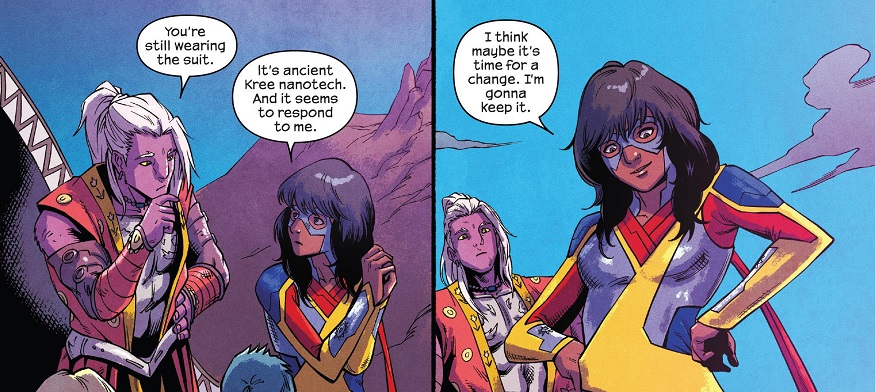 Ms. Marvel finally gets that uglier costume that Marvel promised us a couple of months ago. Thanks, I hate it.