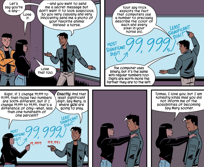 Squirrel Girl, Chipmunk Hunk and Koi Boi beat up the Leader. When they get home and join their friends, they all realize that Brain Drain has been missing for a few days. They check his favorite haunts, but no luck. Then Doreen gets another message that’s just a blank black image. She thinks her phone is broken, but now that they know Brain Drain is missing, they suss out that he’s been sending her encoded messages! We get another patented Ryan North numbers lecture — this time on steganography — and they discover that Brain Drain has been trying to tell them that the villainous Melissa Morbek has escaped and is involved in this some how!