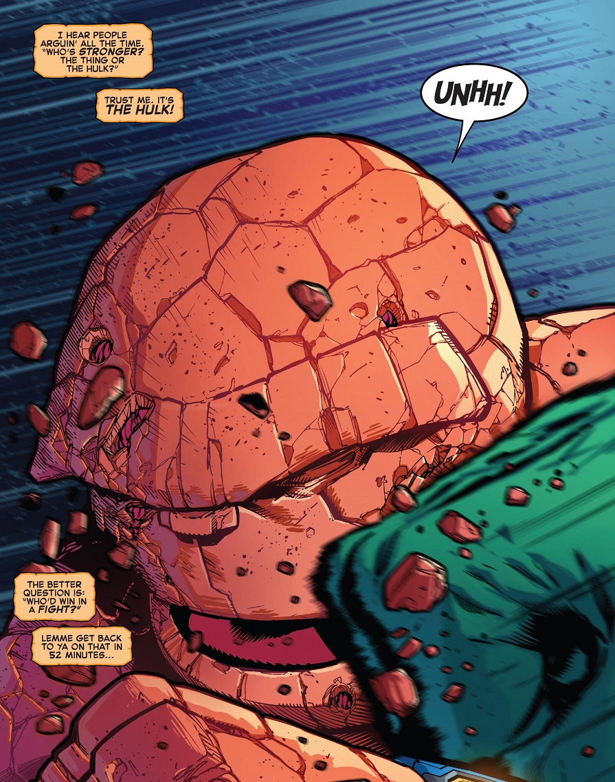 So the Thing fights the Hulk on a tropical island, with the Hulk being controlled by the Pupper Master. Thing tries to get through to the Hulk, but this is Immortal Hulk now and he’s kind of an asshole, so he doesn’t mind being mind-controlled into fighting the Thing. The essentially just trade blows instead of anything too dynamic, with the Hulk mopping the floor with the ever-lovin’, blue-eyed Thing. Then Alicia gives him a pep talk that the Thing has more heart, so Ben gets back to his feet and delivers a haymaker to end all haymakers, knocking out the Hulk! It’s so powerful that it causes the rocks on Ben Grimm’s arm to shatter off! He then reverts to human form and falls down, kaput.