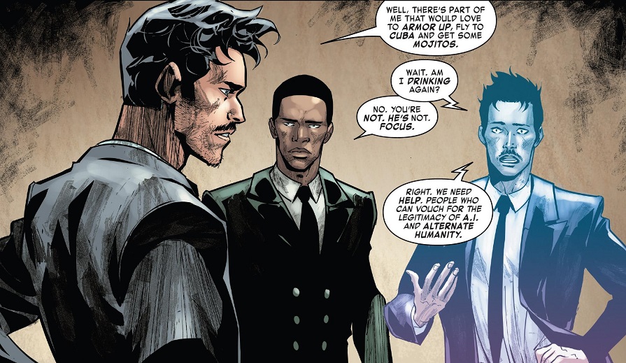 Tony Stark is testifying before Congress about the eScape disaster, as well as the general topic of A.I. rights. He’s being grilled by a particularly nasty Congressman who is really nailing Tony on the details of what constitutes A.I. and how responsible a robot is for their actions. The Congressman then brings out the Tony Stark A.I. that used to be in Ironheart’s suit to question if this A.I. Tony has as many rights and responsibilities as flesh and blood Tony. The biggest moment of the testimony is when Tony reveals on national TV that he himself might be considered an Artificial Intelligence, considering his recent body/mind reboot.