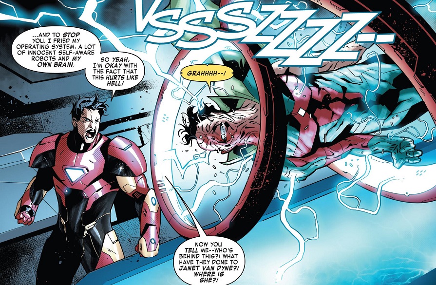 Ultron Pym wants to use a machine to combine the Wasp and Jocasta, so that they will be a human/machine hybrid like him. Iron Man, Machine Man, Rhodey and Bethany Cabe head out to Avengers Mansion and free Jarvis first. Bethany and Rhodey stay outside, while Tony and Aaron head inside and take on Ultron. It’s a wild fight, with Tony and Janet mocking Hank Pym in order to get him to start fighting against the Ultron programming. It’s enough of a distraction that Tony is able to free Janet and Jocasta — but he doesn’t get out of the way in time for when the combination machine goes off! Tony gets combined with his armor!