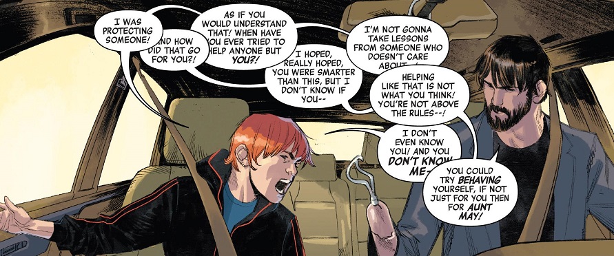 It’s nothing special. There are probably better assessments across the internet. I’m no expert on film theory or the cinematography skills of J.J. Abrams. I don’t know his tropes or his style well enough to compare his movies to this comic. So don’t expect me to be able to break it down along those lines. I’m just a comic book and Spider-Man fan who just read a solidly mediocre Spider-Man comic that doesn’t really provide anything new or monumental. Heck, the Renew Your Vows comic about Spider-Man having a super-powered daughter came out only a few years ago, not to mention Spider-Girl from the 90s. So the idea of Peter Parker and Mary Jane Watson having a super-powered offspring is nothing new. And this first issue doesn’t really add anything new to the idea. It’s pretty rote, to be honest.