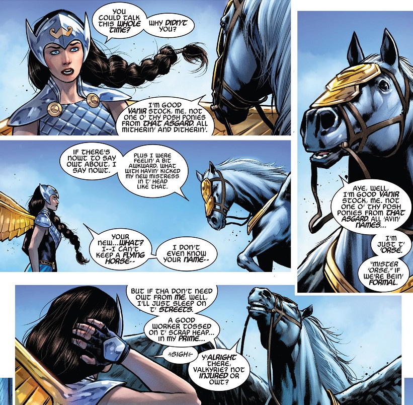 This was a really fun, really neat issue — I just wish it had gone further. Valkyrie isn’t just another superhero. She’s a job. She’s got a job to do. And this issue touches upon aspects of that job. She ferries the dead to their final resting place. And I love that she takes Heimdall on a tour of different afterlives, ending somewhere truly out there and beyond the known realms. It’s a fascinatingly cool ending, even a bit magical. The artist change made it especially cool. So for that bit, the issue is a true success. Then the talking horse with the intense accent is icing on the cake.