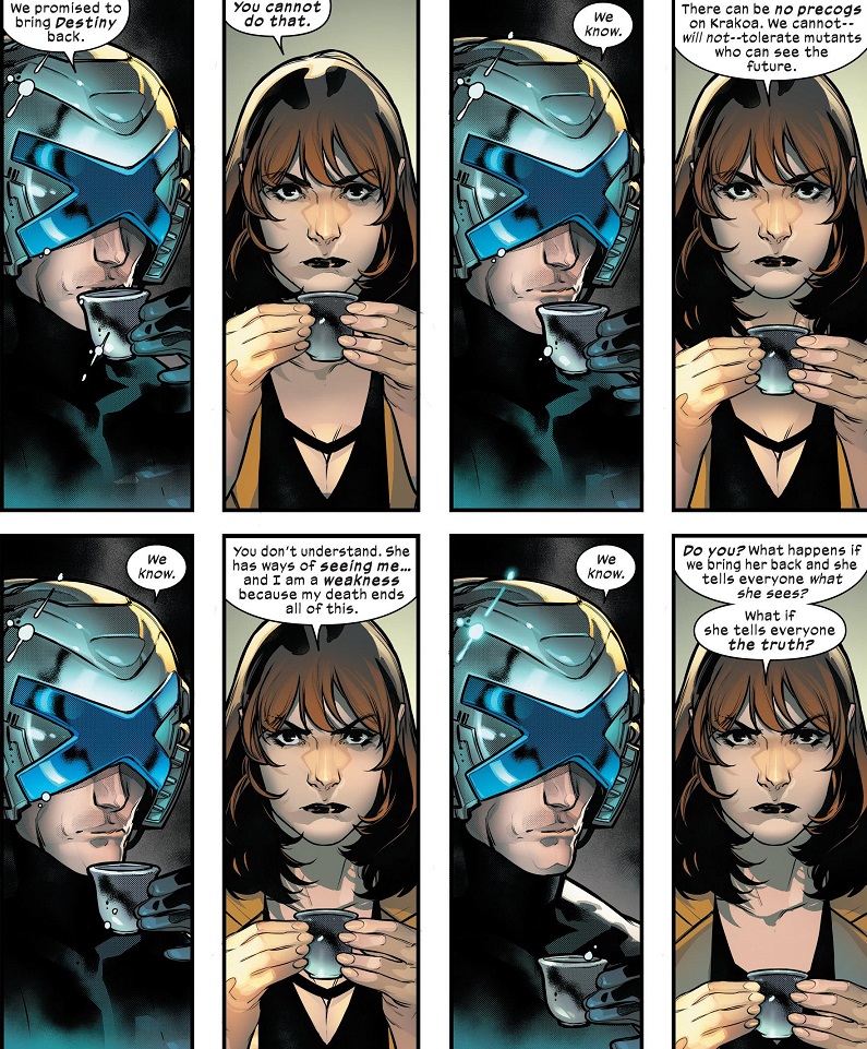 In Year Ten, we see Magneto and Professor X visiting Moira the day before the Quiet Council meeting, wherein they explain why they included the various members. We do not learn the identity of Emma’s Red King, but we find out that Mystique’s request is for them to resurrect Destiny. Moira is against this request because they cannot have mutants who see the future, because that mutant will learn too much about what’s going on and how they always lose. Plus Destiny already has it out for Moira. Xavier knows all of this and says they’ll put off resurrecting Destiny for as long as they can, but someday all of the X-Men should learn the truth.