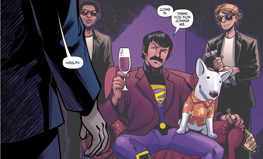 Zan gets the best bits of the issue, though it’s pure silliness. He wears a fake mustache and a coat over his superhero costume to run this little casino. It’s funny and silly, just how it’s expected to be. But rather than really play up the idea that he was being way too serious running a fun casino at a high school reunion, there’s actually a shady-looking guy who legitimately cheats at the casino games that Zan has to deal with. The guy seems way too detailed to just be another reunion attendee, so I think we might see him again.