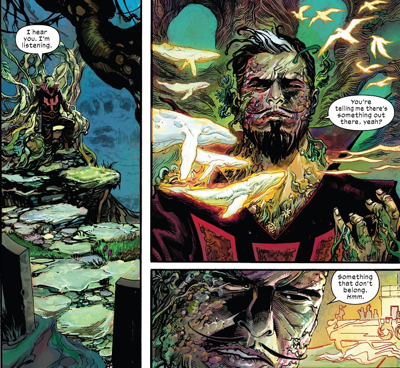 I just did not like this issue. It rubbed me in all of the wrong ways, both artistically and storywise. It took me several reads to fully understand what was happening and put the pieces together because the art was really muddy and did not convey key parts of the story very well, like the Sokovian government putting something in Xavier’s champagne, or the skydiving soldiers somehow posing as Domino. It didn’t help that the comic kept cutting to different brief interludes constantly. It also didn’t help that one of the soldiers looks identical to human Colossus, so I was confused as to who I was seeing at any given time. Did we really need several interludes about how the soldiers hijacked a passenger plane? Why does it matter how these anonymous soldiers got onto the plane they chose? And everything with Black Tom Cassidy and his trees was just ugly and weird and wasn’t easy to follow.