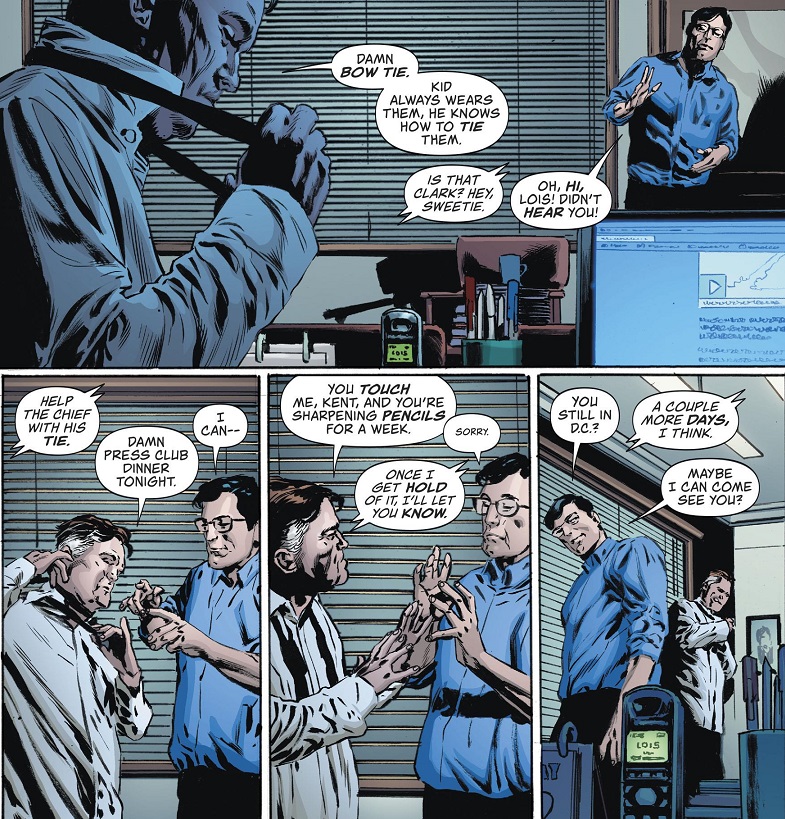 This issue was a bit light on content, but still good overall. This issue is split between an awesome fight scene for the Question against mostly nameless henchmen and a couple of Lois Lane conversations where she explains journalism to sources/the reader. First, there’s a random passenger on the plane, to whom Lois explains the concept how journalists don’t just make stuff up like all those “fake news” claims from Trump. And then with her new source in DC, she explains the various layers of “off the record” or “on background”. Considering I’m an actual newspaper reporter in my day job, I’m thrilled to see Lois be such a bastion for journalism, but it makes for a light issue. I think Rucka just wanted to give readers a primer on important concepts. We also got a fun little scene with Lois calling in to Perry White’s office, with Clark also in the room. That was some really fun character stuff.