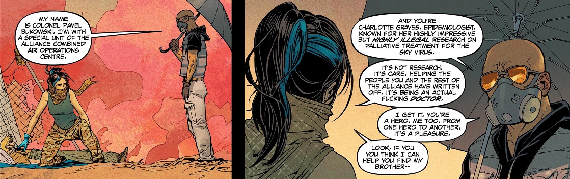 The main cast of characters is fine. Dr. Graves is a little on the nose in terms of protagonist. She’s the sort of woman whose badass, dedicated, and yet cool enough to have a streak of blue hair in a world where there’s something called a Sky Virus that’s going to wipe out the human race in a couple of months. Everybody gets a couple of panels to flesh out their character, but none of them stand out as particularly engaging yet. The pilot was really cool when he recruited Charlotte…but then he got half-eaten by the desert wasteoids, so perhaps he won’t get to be a main character. Everyone else is generally fine and I hope time is taken to flesh them out going forward.
