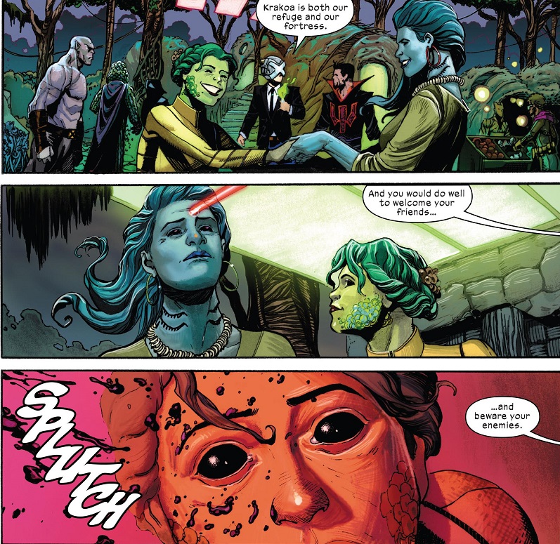 After an infographic filling us in on Krakoa’s biological defenses, we see Black Tom Cassidy as ward of the island and its defenses. He greets Kate Pryde’s latest arrival, with refugees from Russia. Colossus, who was boots on the ground in Russia, was badly hurt in the rescue efforts. Professor X attends a press conference in Sokovia as they sign a treaty, and perhaps they put some kind of tracking device in his drink? The art isn’t clear.