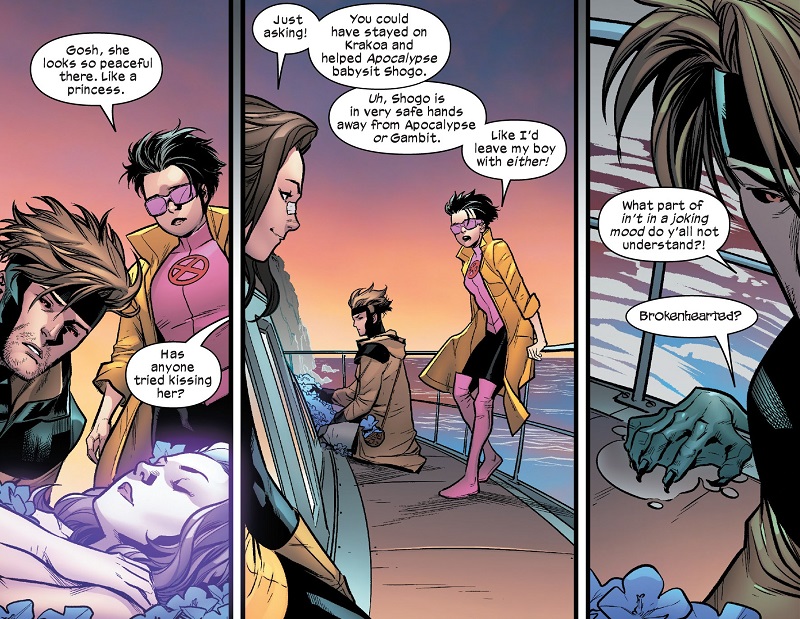 Betsy, Gambit and Jubilee catch a ride from Kate Pryde (because apparently she’s the only one who can operate any boat) in order to take the comatose Rogue to the Excalibur lighthouse. They’re attacked by selkies along the way, likely sent by Morgana la Fey. The team makes it to land, but they can’t find the lighthouse. Betsy finds a group of invisible druids and asks them what happened. They explain that Marianna Stern and Coven Akkaba destroyed it. But when Rogue is planted on the ground, she grows into a new, organic lighthouse, with her as the light. The trio of Betsy, Gambit and Jubilee spend the night, though Gambit is quite grumpy because of what’s happened to Rogue, and Jubilee super misses her son, Shogo — so much so that a bad dream about Apocalypse during the night causes Jubilee to go back through a portal and get Shogo, bringing him to the lighthouse.
