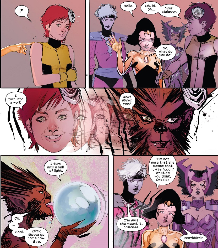 At any rate, all of that actually happened, and now the New Mutants have one of the bad guys prisoner and he reveals that they are walking into a trap, that some of the Imperial Guard are trying to stop Xandra from taking the throne. So the New Mutants arrive back at the palace and spring the trap and get into a big fight, which Xandra stops by being all queenly. The punishment for Oracle for staging this betrayal is to stay by Xandra’s side and teach her how to be a solider. So the day is saved and the New Mutants plant their flower, so now there’s instant teleportation between Chandilar and Krakoa, so they throw a big party. I think Wolfsbane flirts with Xandra, but it’s a really weird little scene. Hickman writes Wolfsbane as very childish and into licking things.