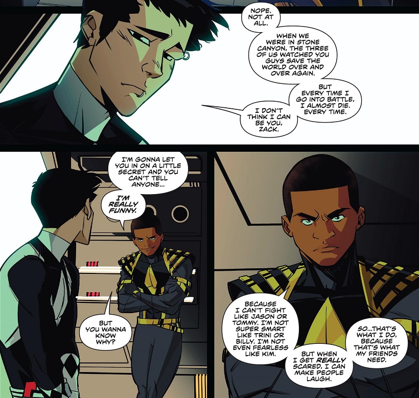 This comic is so consistently awesome. I don’t even feel like the story is dragging all that much. The story and the characters remain entertaining because Parrott is so good at mixing things up, while still delivering that quality character drama we know and love. This issue sees the Rangers using rocket boots to zip between chunks of space debris on the run from a reluctant alien killer! And not even all the Rangers, but a cool mix of characters that never interacted on the real show. Heck, we get a really nice scene between Zach and Adam, the old and new Black Rangers, in a scene that specifically highlights the background nature of the Black Ranger. I only wish this comic had had more time to show off Adam as a character. He hasn’t done much since showing up in this series, so there’s not much character for Zach to bounce off of. But the scene is still a great insert!