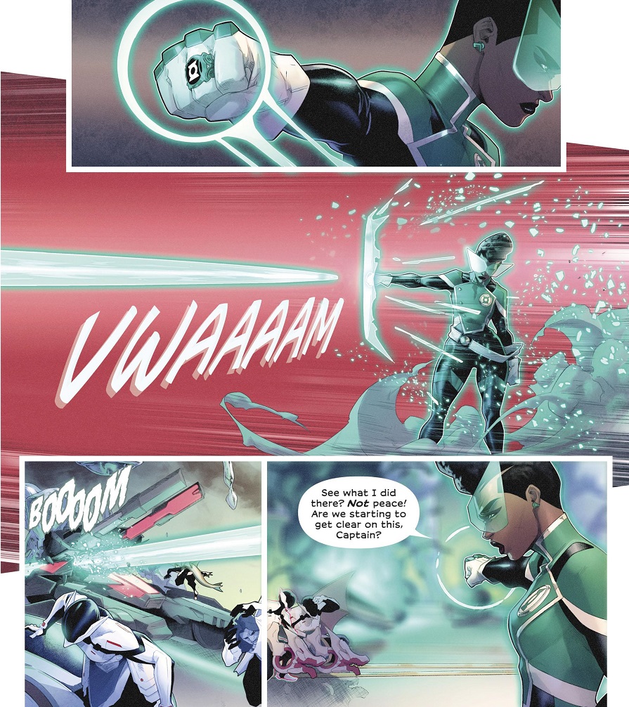 It’s the changes to Jo’s GL ring that have me on edge. When it was first mentioned in the issue, I thought it was really dumb. Why change the rules of the GL Power Ring for this one story/character? What would that serve? If you can’t write a GL story using the rules of the GL, then change your story so that the rules work. There are plenty of ways to make Jo vulnerable if she still uses a traditional Power Ring/Power Battery and Oath. So that was annoying. But then we got to the final page of the issue and the reveal that there’s something special and unique about Jo even serving as a Green Lantern. That completely turned around my earlier annoyance. Now there’s a bit of mystery as to how Jo even became a GL. And that might explain why the GL Corps chose a rookie from Earth to go all the way out to the City Enduring to handle this long term assignment. That new bit of mystery intrigues me enough to overlook the liberties taken with her Power Ring.