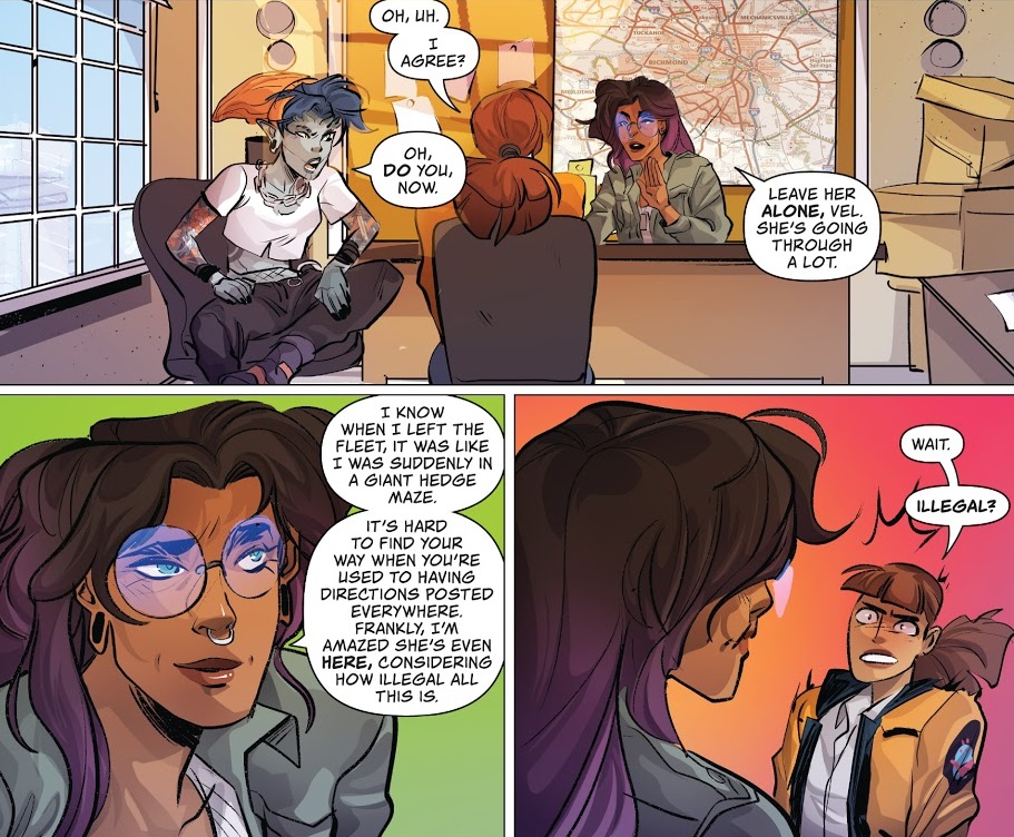 I’m putting way too much concern into this. It’s just that I want to like this comic. The characters and the world seem fun and well set up. The writing is good and the art is great! But the execution is running me around in circles. What is this comic about? Is it about this young woman suddenly finding herself adrift in this cool future Earth, like I’d been led to believe? Or is it about this young woman having a hard time realizing that she’s into women, which feels like it comes out of nowhere, and doesn’t seem to have much to do with this cool future Earth? Is it a combination of the two, even though I don’t think enough work has been done to equate the two?