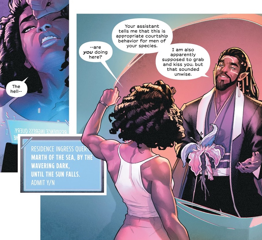 My feelings on Marth aside, their encounter was really well-written and makes perfect sense. Jemisin is really building up the idea that Jo feels more and more alone on this alien planet, and the importance of this emotion storyline. I feel like Marth is taking advantage of that, but perhaps he’s also lonely and these two souls have found each other. It works as character development and it works for this comic. We’re halfway through and Jo is in a bad place. That’s solid storytelling. And the ending is where the action picks back up, so that’s fun too. I look forward to Jo going all out next issue.