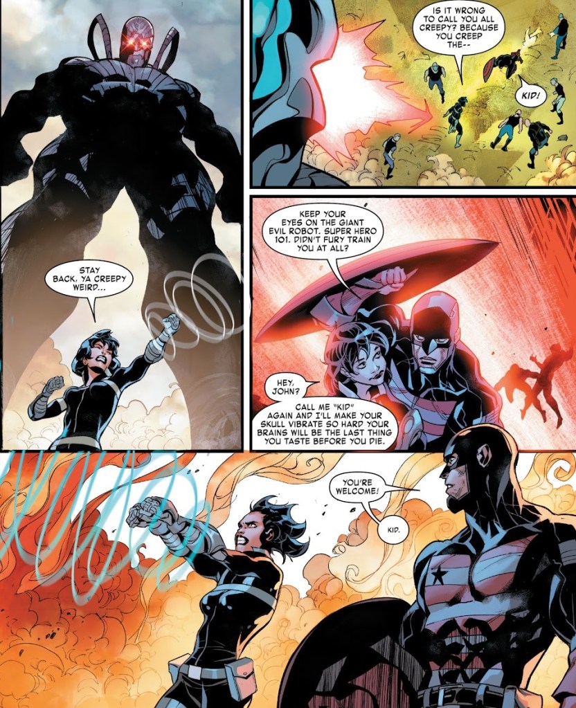 At their debriefing the next day, Maria Hill dresses down the team for their failure, including not getting the files she requested on the Deathloks. U.S. Agent reveals that he secretly downloaded the files to a thumb drive behind the others’ backs, making Quake and Rhodey disgusted with him. But Mockingbird susses out that Agent has handed Hill a blank thumb drive, which should delay her enough so that the clean up teams on the island finish their jobs and leave no evidence behind.