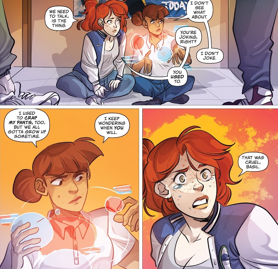 We open with a flashback to when Basil and Charlotte were 16. Charlotte was clearly interested in Basil, but Basil was so about the rules — which apparently are anti-LGBTQ — that she shut it down. We get another flashback later in the issue as we see Basil shut down Charlotte really hard the next day at school, which prompts Charlotte to go along with Basil’s fleet dreams.