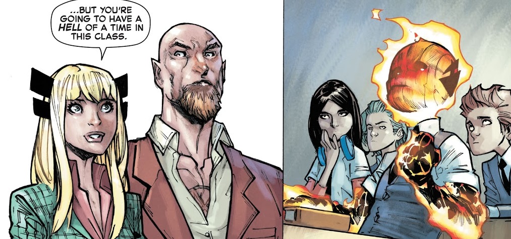 This issue is all about taking a tour of what an actual day at magic school will entail…though knowing how comic books work, one assumes there will be very little day-to-day classwork in this comic. Still, we time skip around from one weird class to the next where the students do all manner of opening day magic and whatnot (there’s a class description page in the back of the comic, like they did for Wolverine and the X-Men back in the day). Iric and Doyle get in trouble in Magik’s class, so she sends them to Hell to fend for themselves for the day. And everybody’s fine. Oh, also, there are way more students in this school than just the 11 main characters, so that’s a thing.