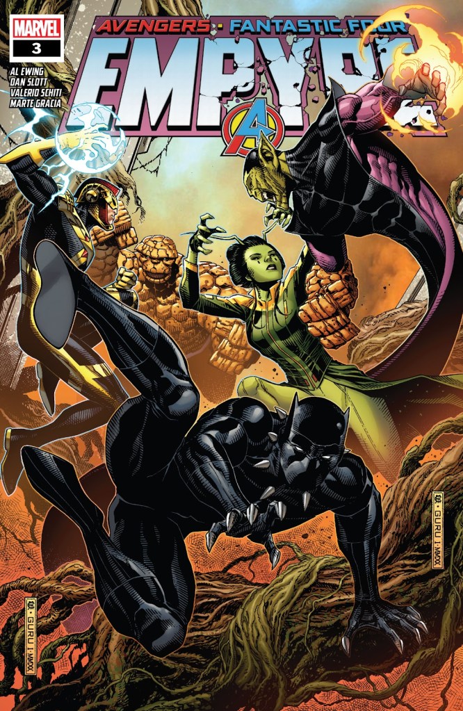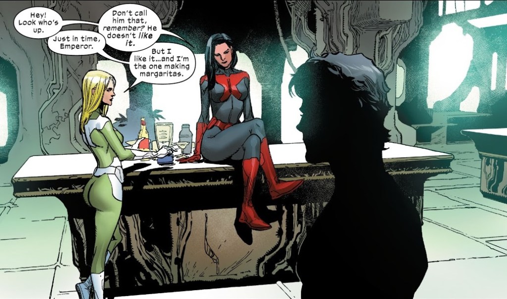 I hope the tie-ins to this comic are amazing, because all the main Empyre series is doing is providing a framework. There’s literally a page in this comic that is just there to reveal that Cap and Thor are off in their own adventures and won’t be appearing in this main series at this time. The rest is all just characters calmly dealing with the events at hand, usually through some kind of conversation. And the timing feels off. It feels like the invasion has been going on for at least a couple days at this point, considering how splintered everyone has become…but the scene in Hulkling’s throne room is exactly as it was last issue. So either this invasion has only just started, or Carol, Sue and Johnny have been standing in that room doing nothing for a very long time. And their conversation is pretty basic. The soldiers have a reckless plan, but the heroes of Earth shrug it off and go with something else. Carol acquiring the hammer of Ronan the Accuser means nothing. It’s just something she holds now. And I cannot explain how deeply uninteresting that last page reveal is. A character I’ve never heard of reveals to another character I’ve never heard of that she’s actually a third character I’ve never heard of in disguise.