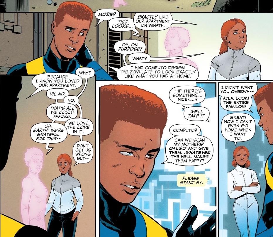 And Bendis balances that zaniness with serious plots that require a Legion that actually functions. This isn’t a slapstick comedy comic. There are real, important matters going down, from war crimes to presidential conferences to invading aliens. If this were a classic Legion, they’d have this all handled, probably. But Bendis’ Legion is struggling, and that makes it far more interesting. I’ll grant you that having so many characters on one page does seem a bit overwhelming, but he manages them all well enough. This is the sort of comic that would benefit from a sister title, one that Bendis could write that could go into more personal and intimate moments between the members. I’m dying for more of the new Matter-Eater-Lad. And what little bits we get to see of the Legionnaires is really fun and could use more fleshing out. We get a really nice scene where Lightning Lad moves his family into their new apartment on Earth, and he had the computer make it look exactly like their old, rundown apartment because he thought his moms loved that apartment, but…