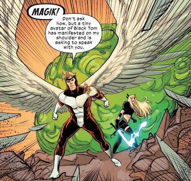 Black Tom Cassidy shows up to help at one point by collecting the pollen particles off Angel and forming a tiny little avatar person. It’s nuts. They try to use Krakoan plantlife, but that just makes it worse. Magik gets more and more pissed off, at one point almost banishing the Hordeculture ladies to Limbo. Eventually though, wearing her full gleaming armor, Magik the War Captain puts out a call to all of Krakoa: any and every available psychic is to report to Genosha for battle. And through the gateway march the likes of Quentin Quire, Shadow King, Lady Mastermind, Mastermind, Selene and more. It’s awesome!