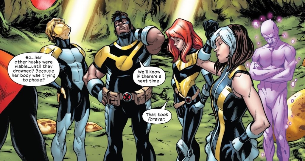 At least, I think this is the explanation for what’s wrong with Kate and Krakoa. Her specific powers just weren’t working with the egg system. Makes sense. I hope that explains the portals as well. It’s a neat mystery, but this works as a solve, so they don’t need to drag it out more. Kate’s resurrection is appropriately important-feeling. I’m especially enjoying the relationship between Kate and Emma. That has been a major highlight of this comic as a whole. I was a little surprised at how few characters were used at Kate’s funeral, but perhaps that was an artwork thing. The rest of the story definitely feels appropriate. Kate’s resurrection is treated as momentously as it should.
