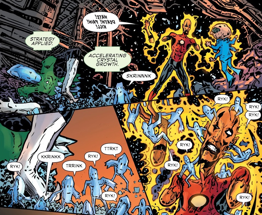 Hal Jordan is rushed to the space hospital Sector General, which we were introduced to a bunch of issues ago. He’s attended by Nurse Leylo Olaqua, who knows her job well. The hospital is attacked by the Qward-Man, who has brought along a whole squad of Qward-doppelgangers. They kill some GLs who were coming to visit Hal and then wreak havoc in the hospital. Lanterns Ryk and Tru get stuck in battle. Tru is terrified and gets her arm cut off. Ryk gets blasted as well…but his salt body is not so easily defeated and he turns into a bunch of tiny versions of himself to fight off his attackers. It’s fun!