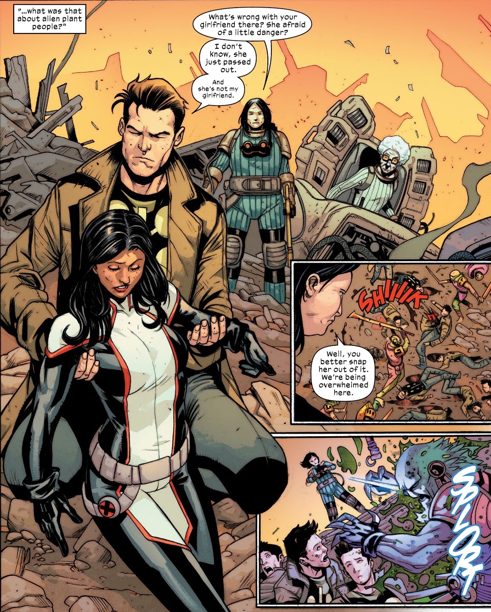 Meanwhile, Magik teleports one of the Hordeculture ladies to Krakoa, and she and Beast work up a serum to kill the plants. Nightcrawler then joins the fray to teleport the serum to Genosha to fight.