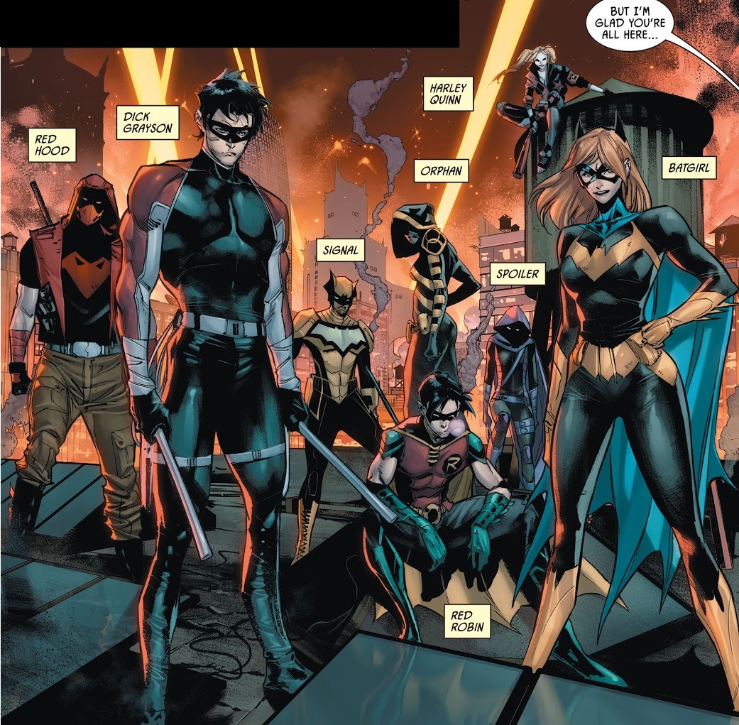 While the general flow of Joker War is fine, this penultimate issue reveals that there’s just not very much in the way of meat on these bones. Gotham City is in turmoil and flames, but we only ever see that from a distance. There are no Gotham citizen POV characters. So this just feels like any other time Gotham has been brought to its knees, and a long Joker monologue isn’t going to fix that. Then we have yet another scene where Batman gathers the Bat-Family on a rooftop. I honestly do not know how often we have seen this exact thing over the past few years, but surely it’s been a lot, right? It’s enough that I recognize this as a common recent trope. Just plop the likes of Tim Drake, Spoiler, Cassandra Cain, Batgirl and the rest on a rooftop for a quick scene and that’s supposed to be fun and exciting? It’s quite casual.