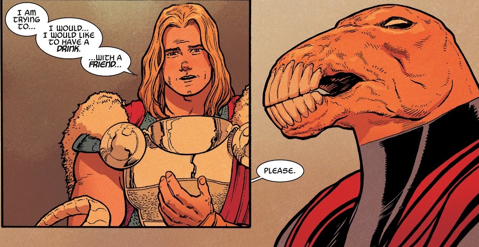This was a very enjoyable Thor comic, filled with all manner of things I really enjoy about comic books. The bulk of the issue is a tense sit down chat between Thor and longtime friend Beta Ray Bill. It’s so casual that Bill removes his helmet. We never see Bill without his helmet and it’s both weird and awesome.