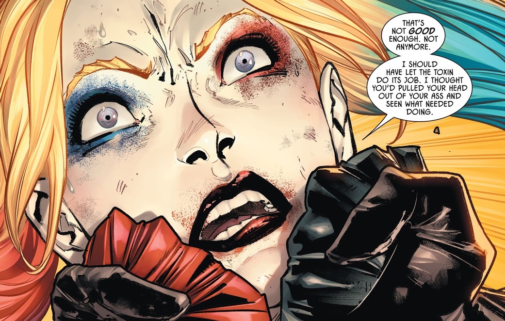 One interesting story thread in Joker War is that Harley Quinn is teaming with the Batman solely so that she can kill the Joker…but, obviously, Batman’s not going to allow that. Tynion doesn’t even really explore why Batman doesn’t even consider killing the Joker this time, or letting Harley kill him. He’s just against it, like always, and Harley has to scream her frustration into the void. Batman seems perfectly content with just locking the Joker up again after this, and Tynion doesn’t explore how weird that is, given the circumstances.