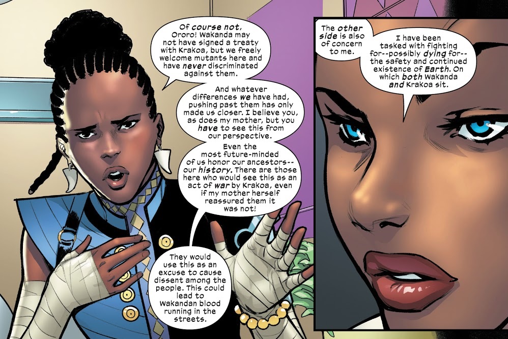 It’s Storm’s turn to get a sword and she knows just the one: Skybreaker, the sword of Wakanda. So she goes to meet with the Queen Mother and Princess Shuri (T’Challa is out somewhere). Storm fills them in on the coming danger and her need for Skybreaker, but they cannot allow it. The blade is too important to Wakanda. They ask her to wait until T’Challa gets back so he can decide. Later, Shuri and Ororo sit down for dinner and talk this out. Basically, there’s a ton of political red tape behind the idea of anyone but the king removing Skybreaker from Wakandan soil, because we wouldn’t have conflict in this issue otherwise.