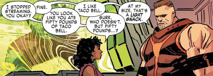 This series continues to be a nice, grounded look at the psyche of Cain Mario as he attempts to use his powers to make some kind of amends — only everything he does seems to keep backfiring. That’s a solid mini-series idea for the modern Juggernaut. I especially enjoyed the flashback scene where Charles Xavier visits him in the hospital (mental projection) and has to let him down rather harshly that Xavier isn’t there to invite him to Krakoa and the X-Men. It’s harsh, but it’s good character building stuff. Helps give this issue some weight. And D-Cel is fun, but little more than a narrator/sidekick at this point.