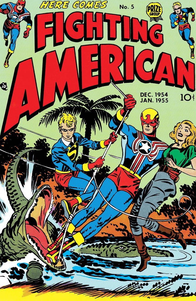 Speaking of similar superheroes back in the Golden Age comes Fighting American. Captain America was created by comic book legends Joe Simon and Jack Kirby. And Fighting American was created by…comic book legends Joe Simon and Jack Kirby. Turns out, the pair were pretty perturbed in 1954 when Marvel Comics (Atlas Comics at the time) decided to bring back Captain America for a new comic. So the pair decided they could do it even better and introduced Fighting American with Harvey Comics. They intended to pit him against Communists in the vein of Senator Joseph McCarthy…until McCarthy revealed himself to be a maniac. Simon and Kirby quickly transitioned Fighting American into more of a satire of the times.