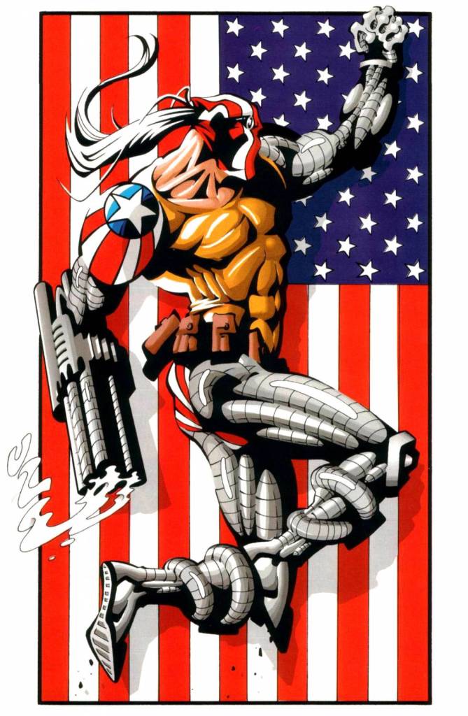 From the mind that brought us Savage Dragon and his part of the Image Comics revolution comes SuperPatriot! Like a lot of America-themed superheroes, Johnny Armstrong started as a WWII soldier. He got kidnapped by Nazis and turned into a superman, only to rebel and destroy everything around him. He was a hero for the following decades until he reached the extreme ’90s! SuperPatriot was half-eaten by a villainous shark-man and was left for dead, so he got turned into an even cooler and more extreme cyborg warrior! Only then could he handle the 1990s.