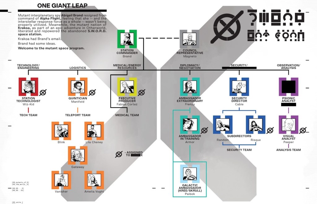 Magneto arrives at the Peak, the space station for the new mutant-operated SWORD. Commander Abigail Brand gives him a tour of the facility, and we pop in on a bunch of mutants and their various roles in the facility. The comic opens with a nice flow chart of said mutants and their roles, so that’s helpful. It’s all kind of dry, but we get some solid character beats here and there, like Magneto dismissing Fabian Cortez, while also exalting Peepers. Or the fact that Krakoa’s hatred of the Scarlet Witch puts them a bit at odds with her son, the new emperor of the Kree/Skrull alliance.