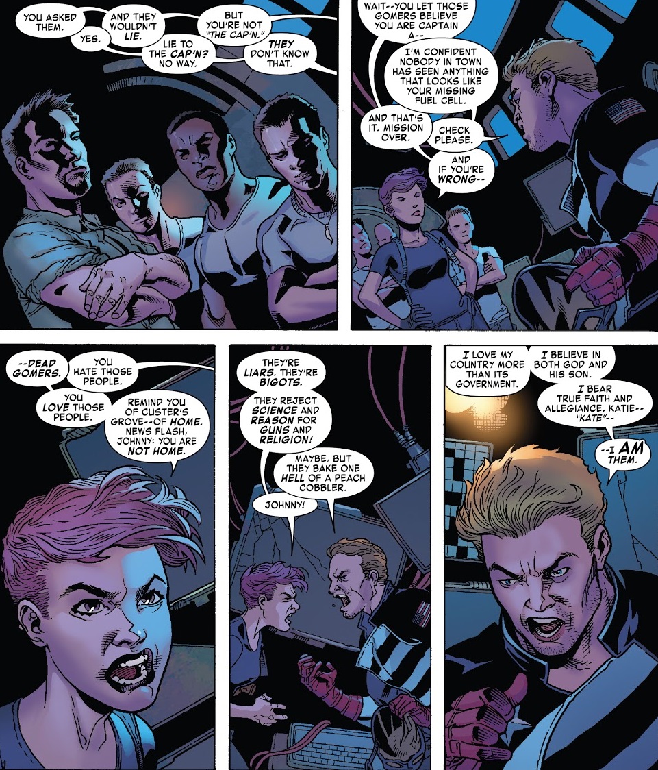 So U.S. Agent and his new friend Morrie were shot down over Brambline Cross by a military group which includes his sister, Kate, whom he hasn’t seen in a long time. They get to bickering/catching up and she explains that her group is watching over some classified asset down in the mine, but when the townsfolk blew up their secret base (posing as a distribution center), it damaged some experimental fuel cells. So John fixes his bike and heads into town to get back a missing fuel cell — only for his bike to break down, and he gets a ride from a local. When he gets to town, everybody mistakes him for Captain America and he asks them about the fuel cell. They tell him they’ve never heard of such a thing, and he reports this back to his sister.