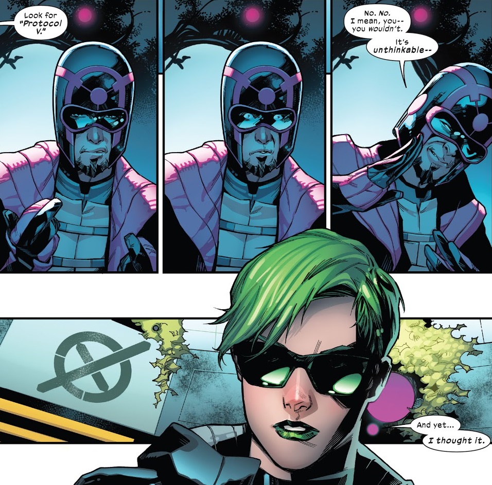 That was a short synopsis, but only because I kept to the immediate story beats. This issue is jam-packed with dialogue and fun character moments. This is a talkie comic, and I rather enjoyed it. From getting to know Mentallo a lot more, and his place in this crew, to Fabian Cortez’s various machinations, to Agent Brand as she commands all these different ops, to even a little scene where the Five debate whether or not to abandon their duties to help fight Knull. This issue is a great mix of character use and forward momentum.