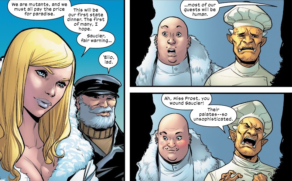 Two things of note: we spend a bit more time with Saucier, a mutant chef who I immediately love. And I should be careful what I wish for. I want more comics exploring the day-to-day operations of Krakoa…and that’s pretty much exactly this. Maybe the best can’t spin boring business discussions into comic book gold…