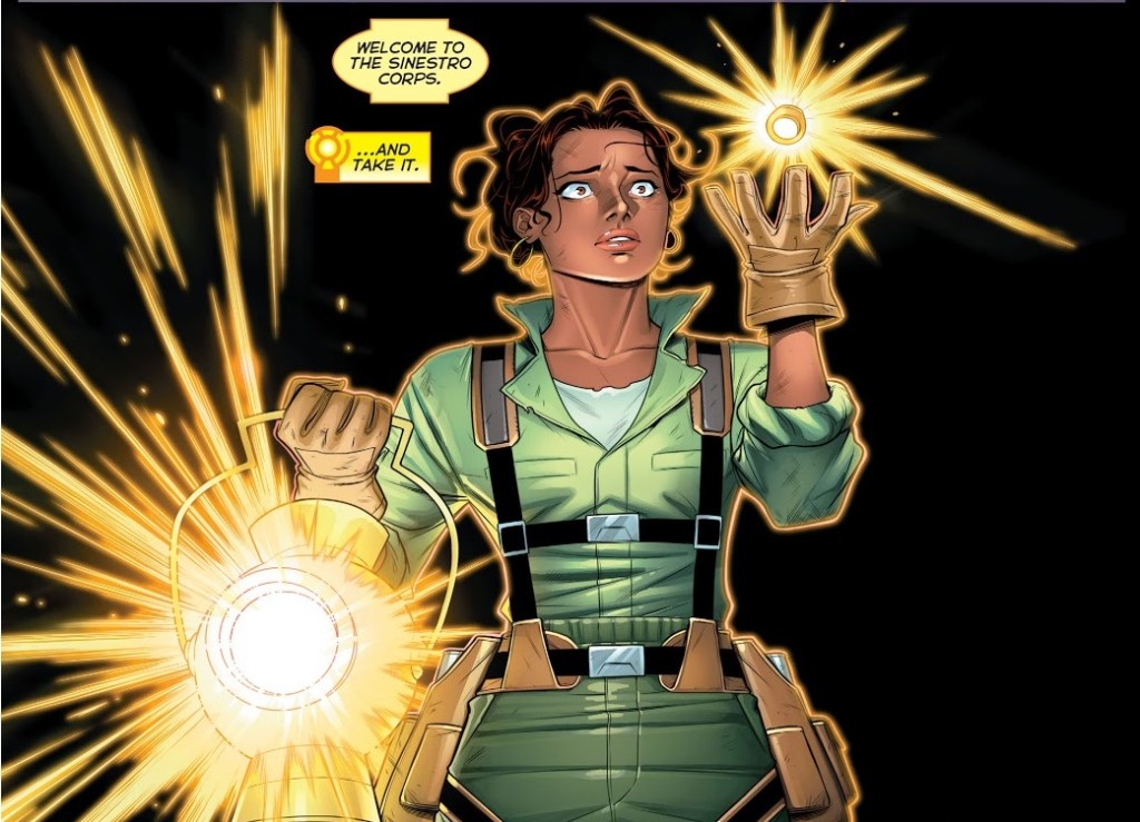 In the first back up story, a powerless Jessica Cruz goes all Die Hard on a trio of Sinestro Corps members who arrive at her former GL satellite office and try to take it over. In the end, she proves she is capable of instilling fear, so one of the yellow rings inducts her into the Sinestro Corps.
